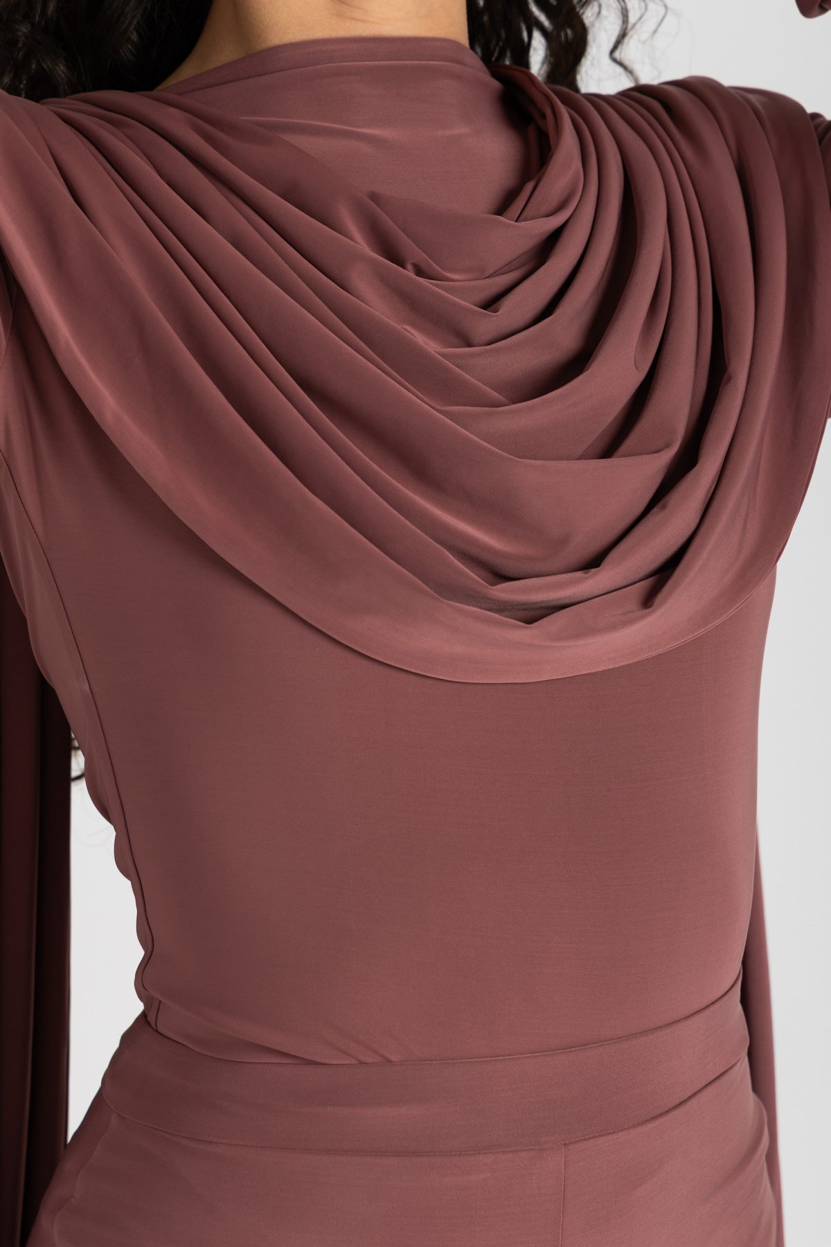 - Asymmetric draped neckline with integrated cape detail