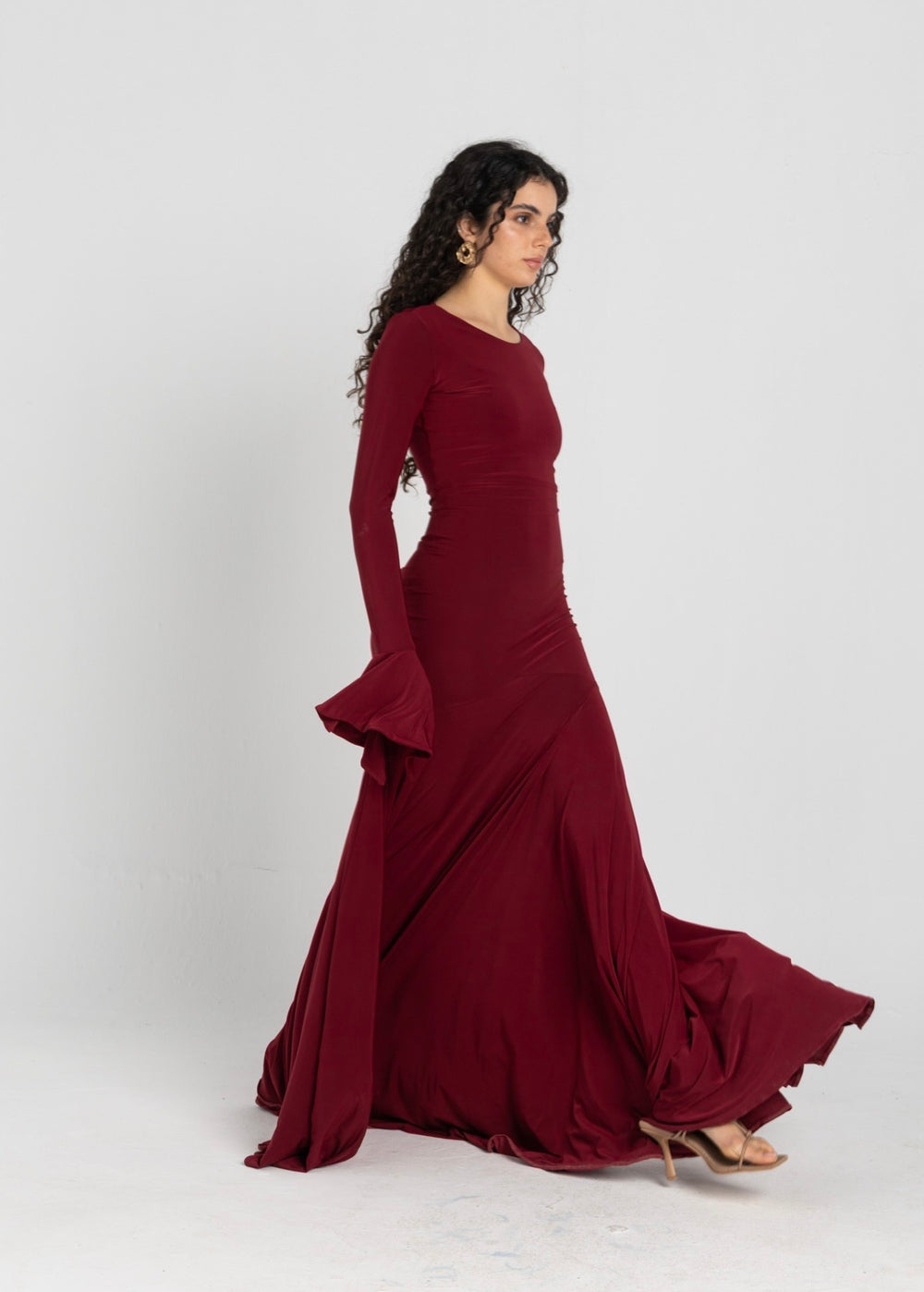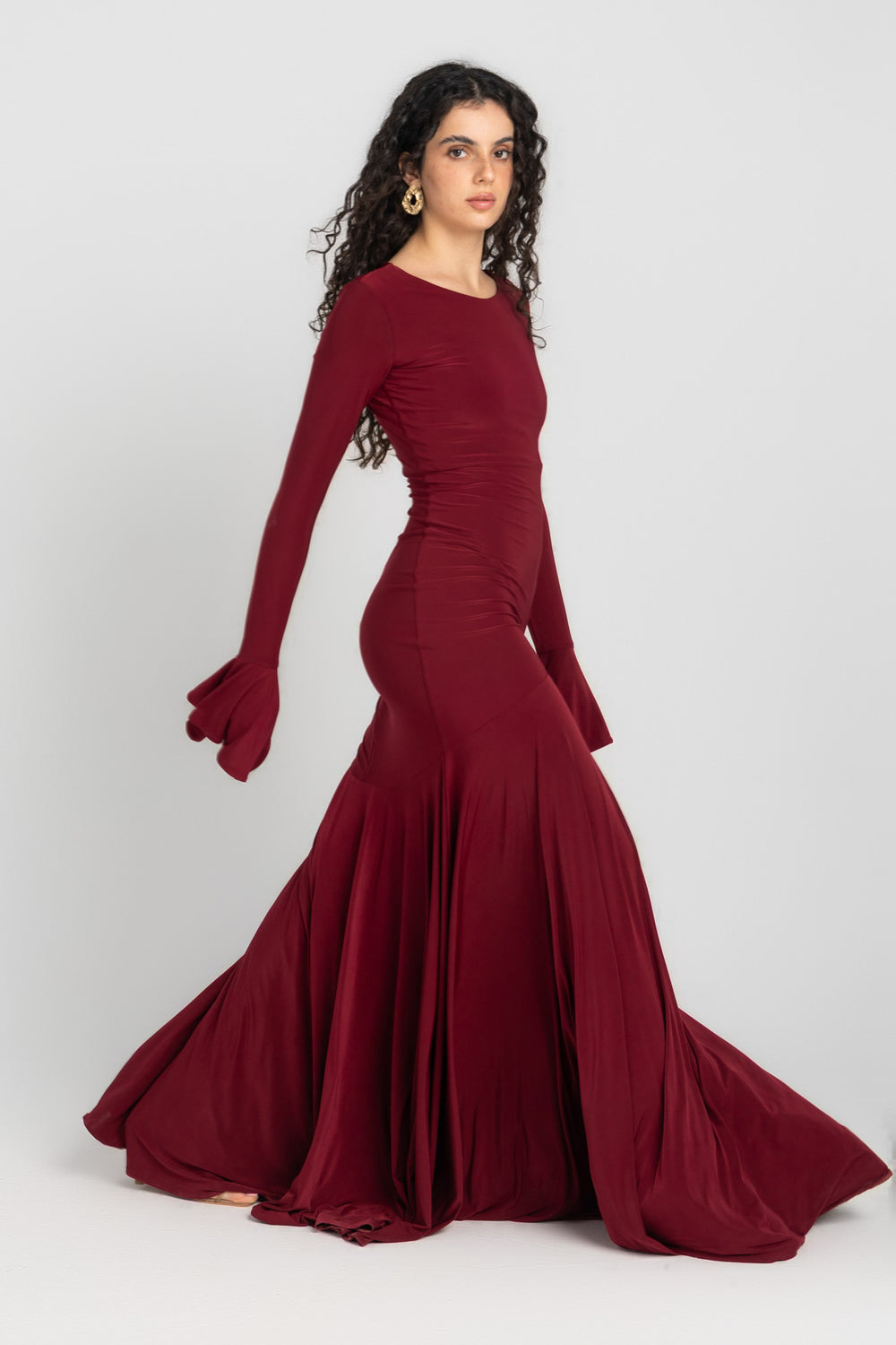 A double-layered construction contours the body precisely through the torso, then releases into a sweeping mermaid flare through a seamless V-shaped seam placed just below the hip. This engineered seam visually elongates the body, enhances the waist-to-hip transition, and creates a natural dramatic flare — without bulk, without stiffness, without compromise.