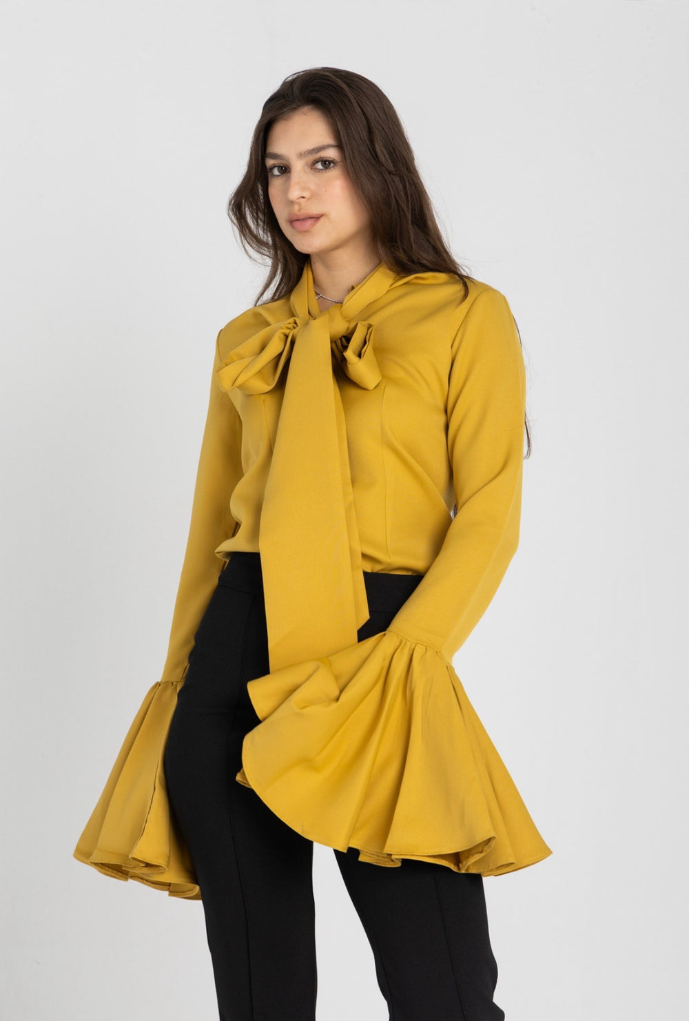 Turn heads without trying. This elegant cool mustard blouse is designed to make an impression with its dramatic layered ruffle sleeves and soft tie-neck detail. Crafted from a fluid, lightweight fabric, it moves beautifully with you while delivering a polished, high-fashion silhouette.