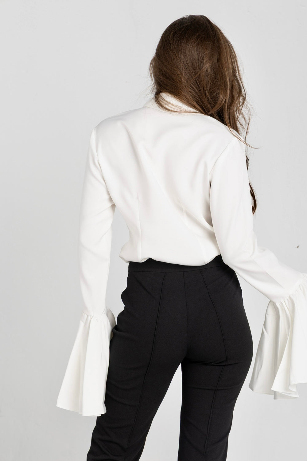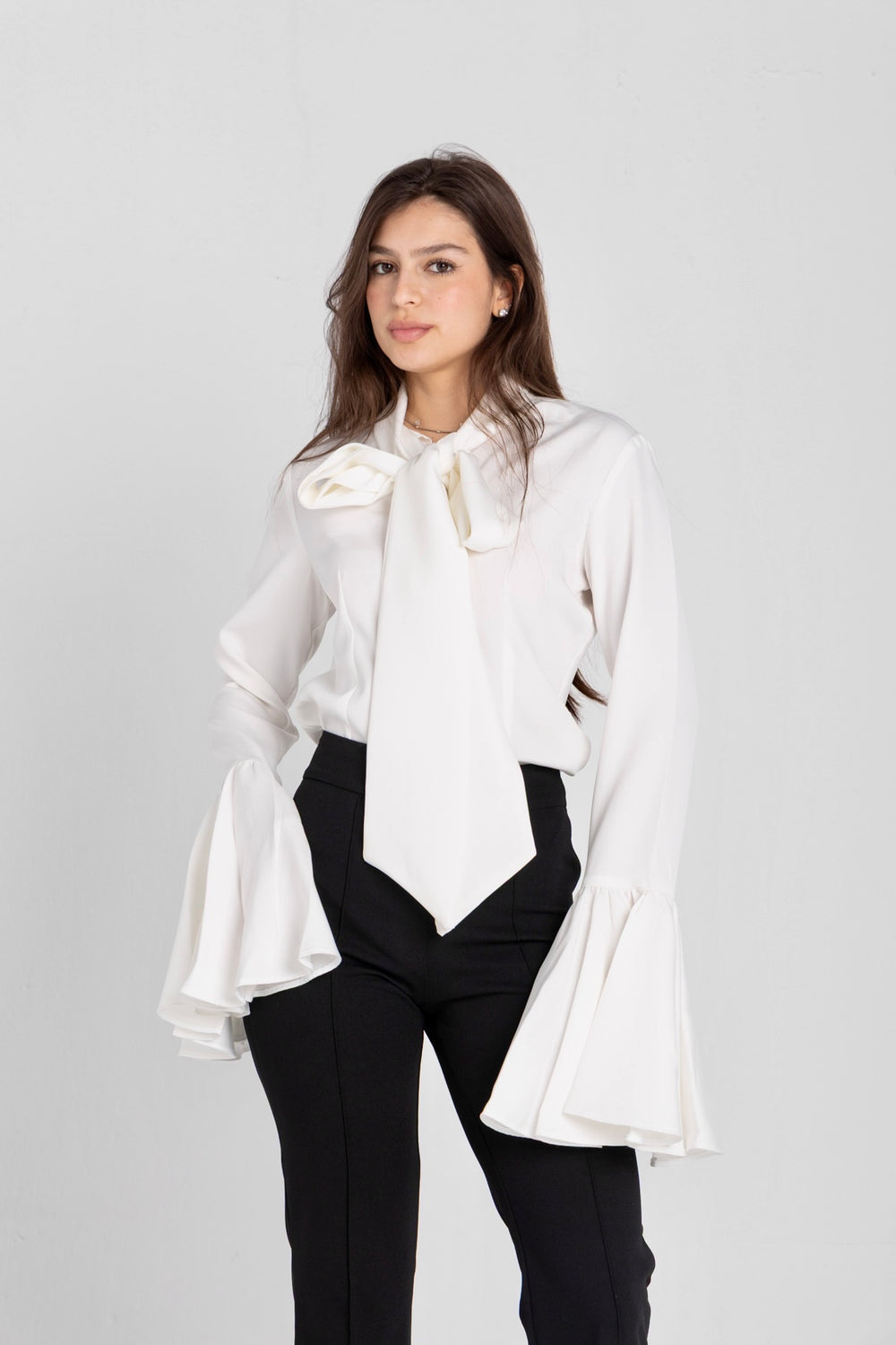 The exaggerated bell sleeves add instant drama, while the tailored body keeps the look refined and flattering. Whether styled with tailored trousers for work or dressed up for evenings out, this blouse brings effortless sophistication to any outfit.