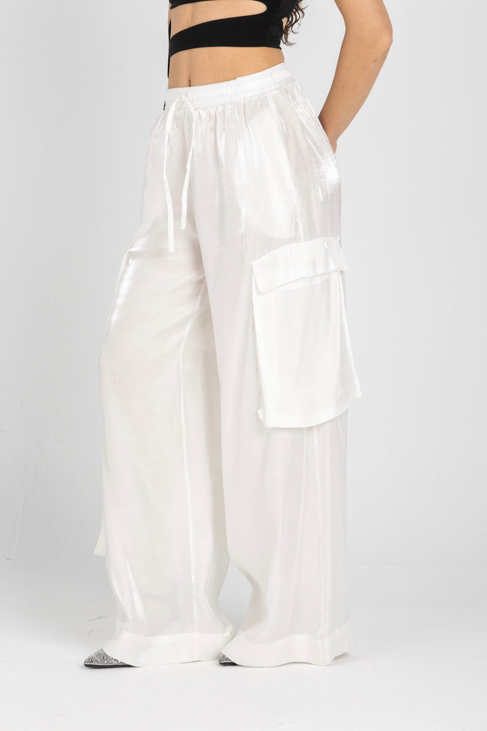 Oversized cargo pockets add a utilitarian edge while maintaining a fluid drape, giving the piece a modern contrast between softness and structure. The shimmery finish catches light naturally, making it equally suited for day styling or elevated evening looks.