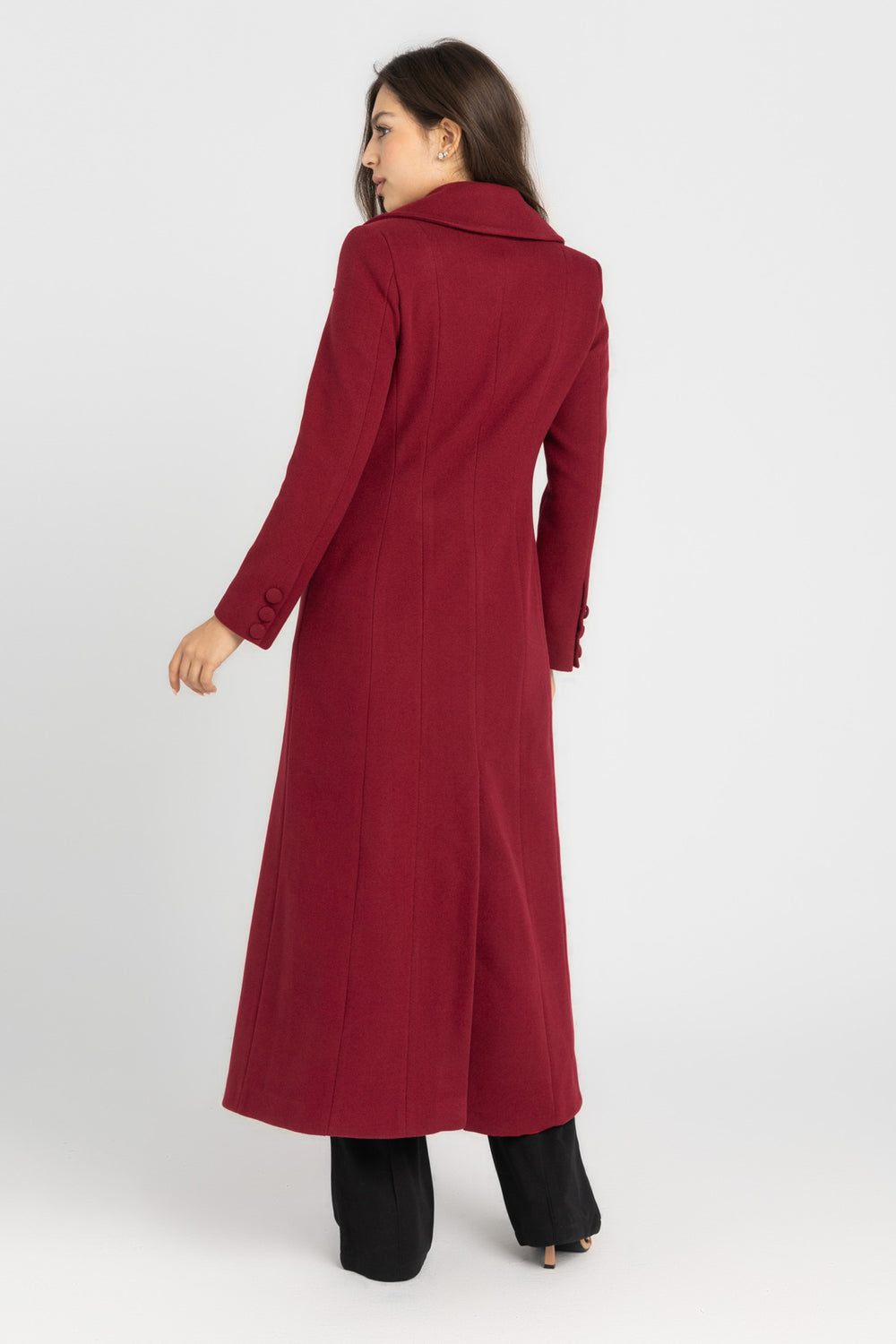 The Monarch Coat is a statement of structure, authority, and restraint. Designed with a long, uninterrupted silhouette, it elongates the body while maintaining a sharply tailored presence. The cut is clean and intentional—cinched through the waist to define shape, yet relaxed enough through the body to move with ease.