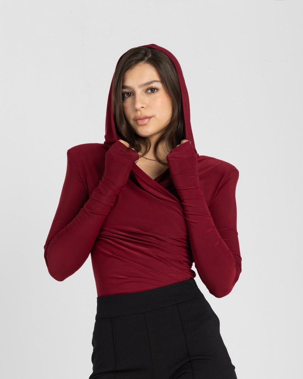 This burgundy structured shoulder bodysuit brings deep, luxurious color and refined style to your wardrobe. Crafted from premium stretch fabric that moves with you, it delivers a flattering, comfortable fit that hugs your curves beautifully. The distinctive shoulder padding creates a statement silhouette while enhancing your natural shape for a polished, editorial aesthetic.